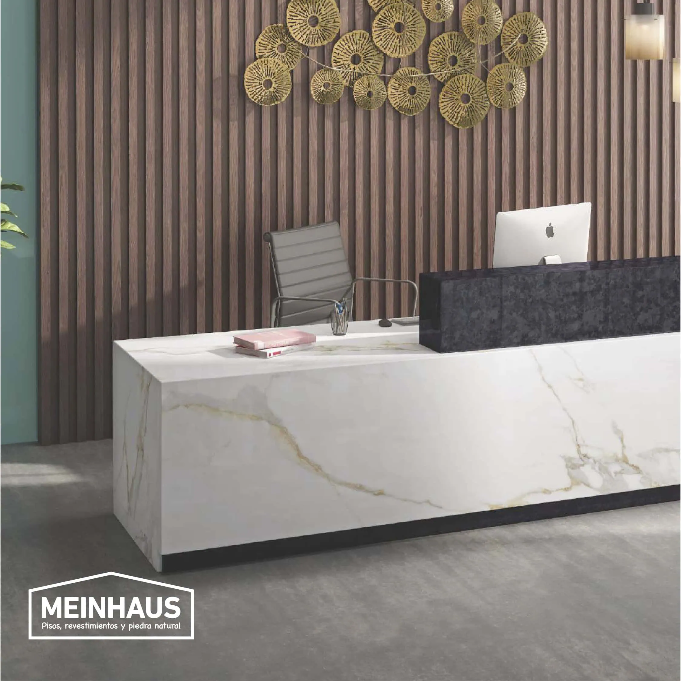 Porcelanato apolo white en recepción de oficina moderna con pared de madera y decoración de acero inoxidable, ideal para espacios empresariales elegantes en Ecuador.