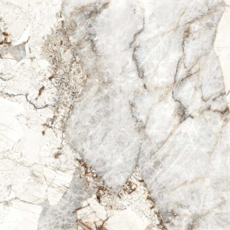La piedra sinterizada Patagonia Crystalo destaca por su estética sofisticada y natural, inspirada en formaciones geológicas únicas. Su superficie presenta una base en tonos blancos y marfil, combinada con grandes vetas y fragmentos translúcidos en grises suaves, acentuados con delicados matices dorados y terrosos que aportan profundidad y elegancia.