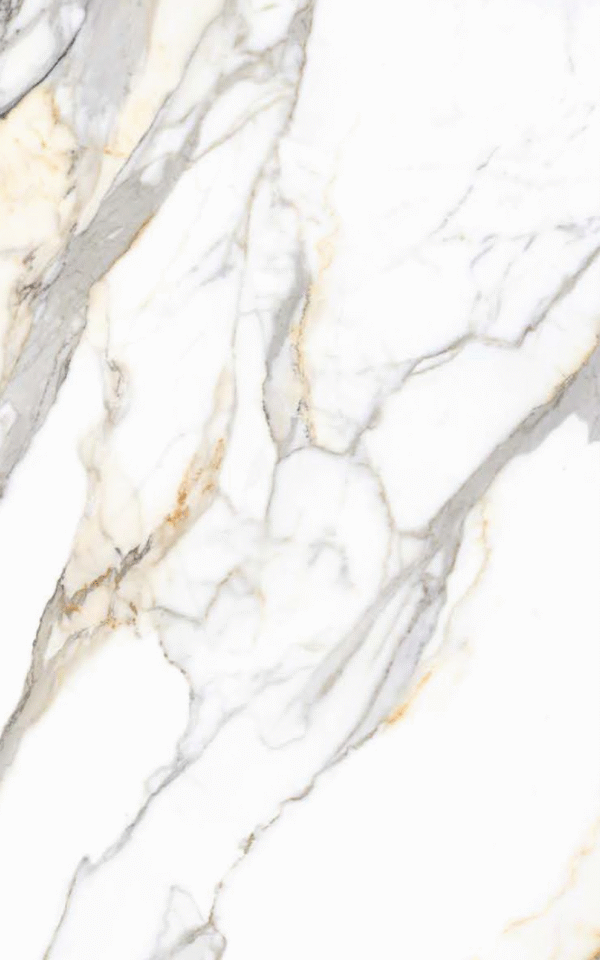 El porcelanato Calacutta Royale destaca por su diseño elegante inspirado en los mármoles más exclusivos. Presenta un fondo blanco luminoso atravesado por vetas grises y delicados matices dorados que aportan calidez, sofisticación y un carácter altamente decorativo.