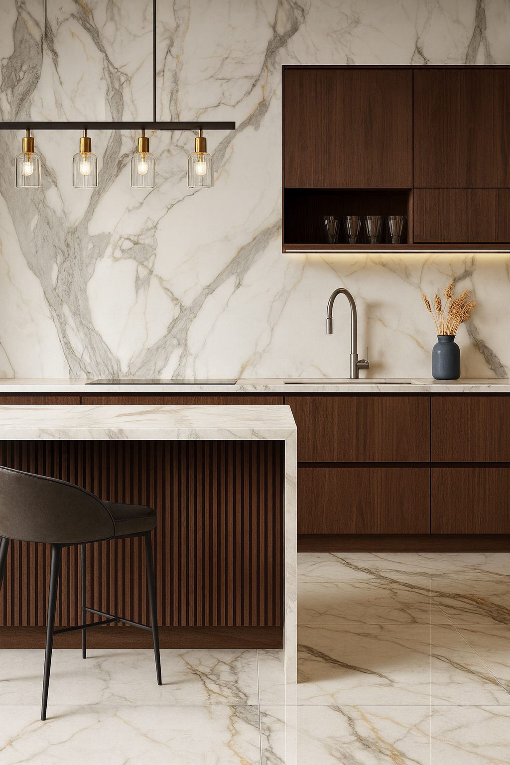 Su acabado pulido brillante realza la profundidad de las vetas y genera una superficie espejo que maximiza la luz, aportando amplitud y una presencia imponente en cualquier ambiente. Perfecto para espacios residenciales y comerciales donde se requiera una estética elegante, limpia y de alta categoría.